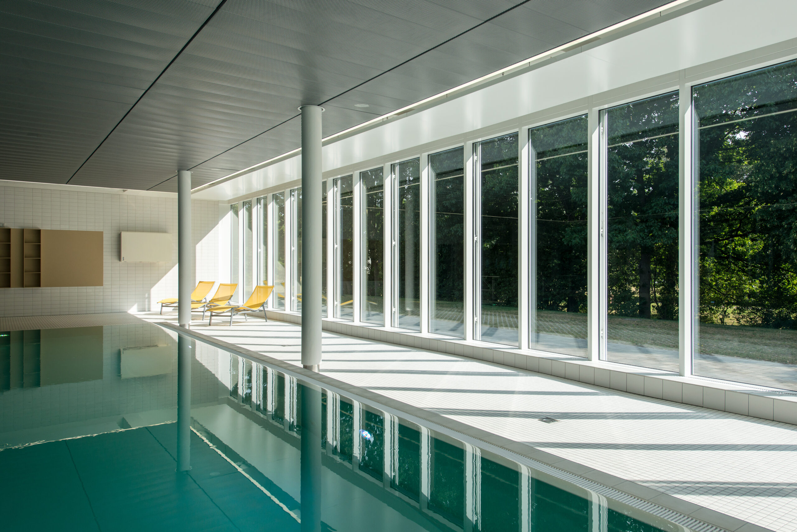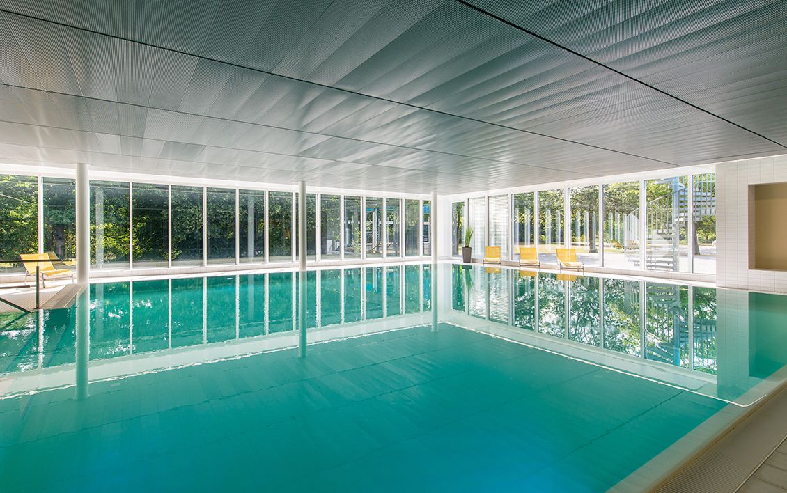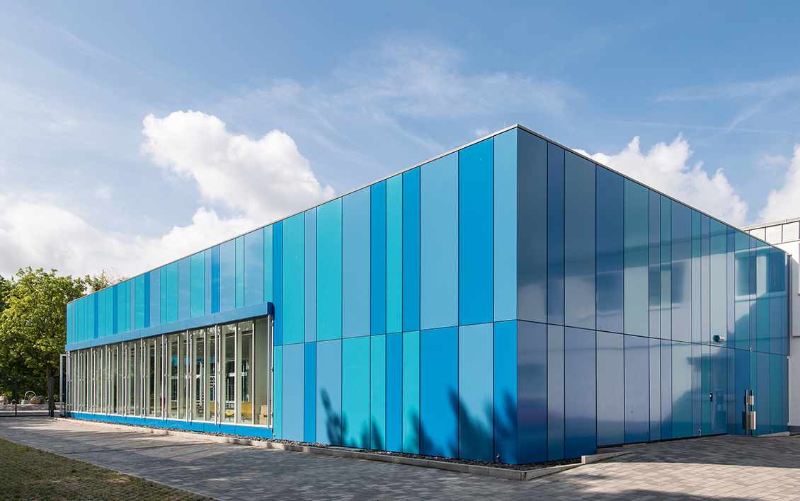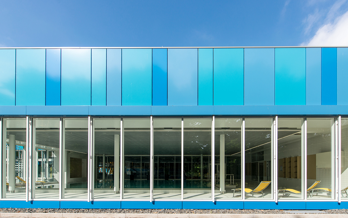 Mit der Erweiterung des Schwimmbades Ringallee und der Fassadensanierung der Schwimmhalle hat das in der Bevölkerung beliebte Bad aus den 60er Jahren ein frisches Gesicht durch eine zusätzliche Wasserfläche für `Aquafitness´ erhalten. Eine Blechfassade in unterschiedlich breiten Segmenten und nuancierten Blautönen spiegelt die Funktion des Gebäudes nach außen wider. Der neue Raum verbindet sich durch seine großen Glasfassaden mit der umliegenden Parkanlage. Innen- und Außenraum fließen somit ineinander. Wie eine `schwebende Scheibe´ legt sich die glatte Streckmetalldecke über das Becken und prägt die ruhige und ausgewogene Raumatmosphäre.