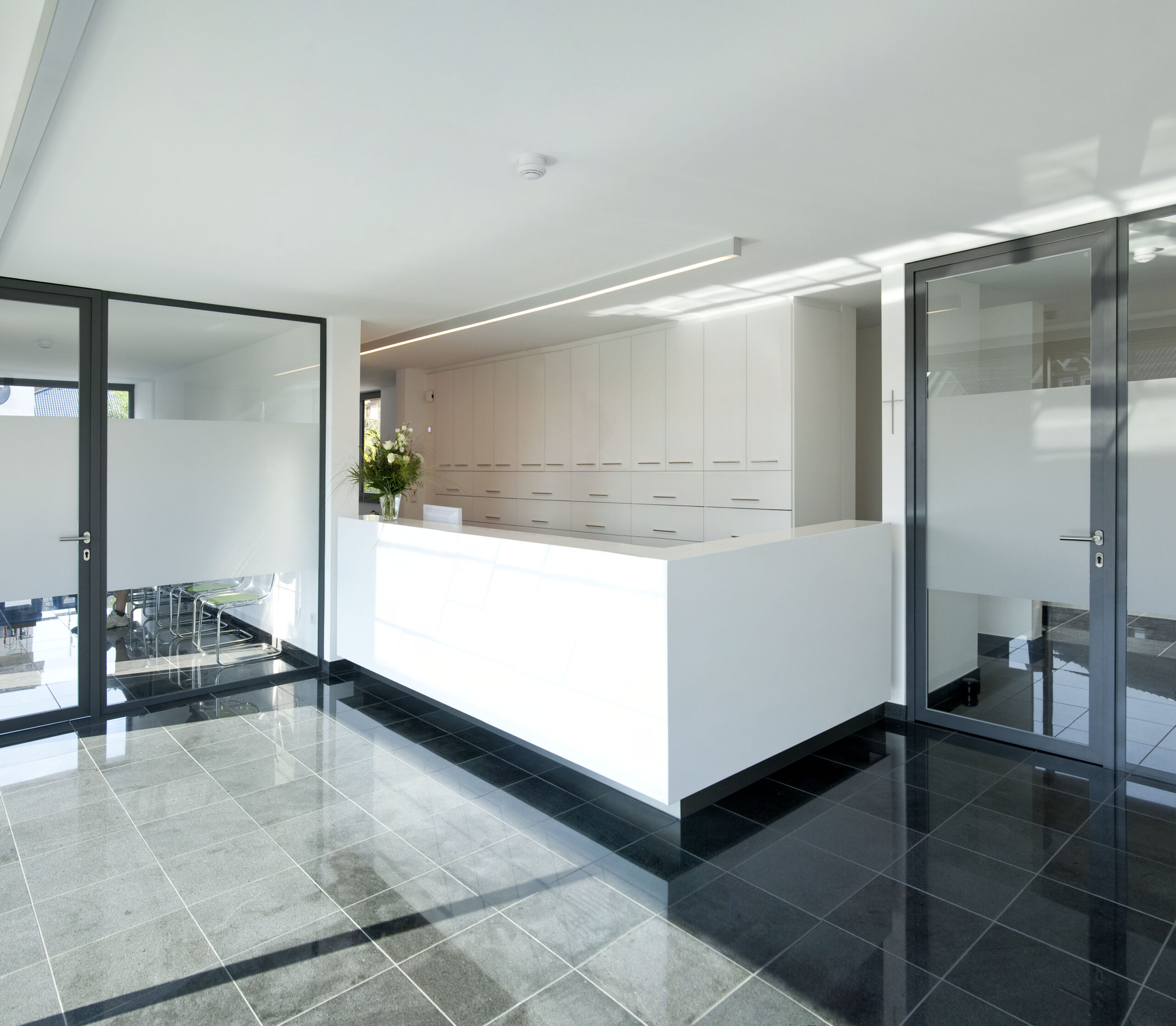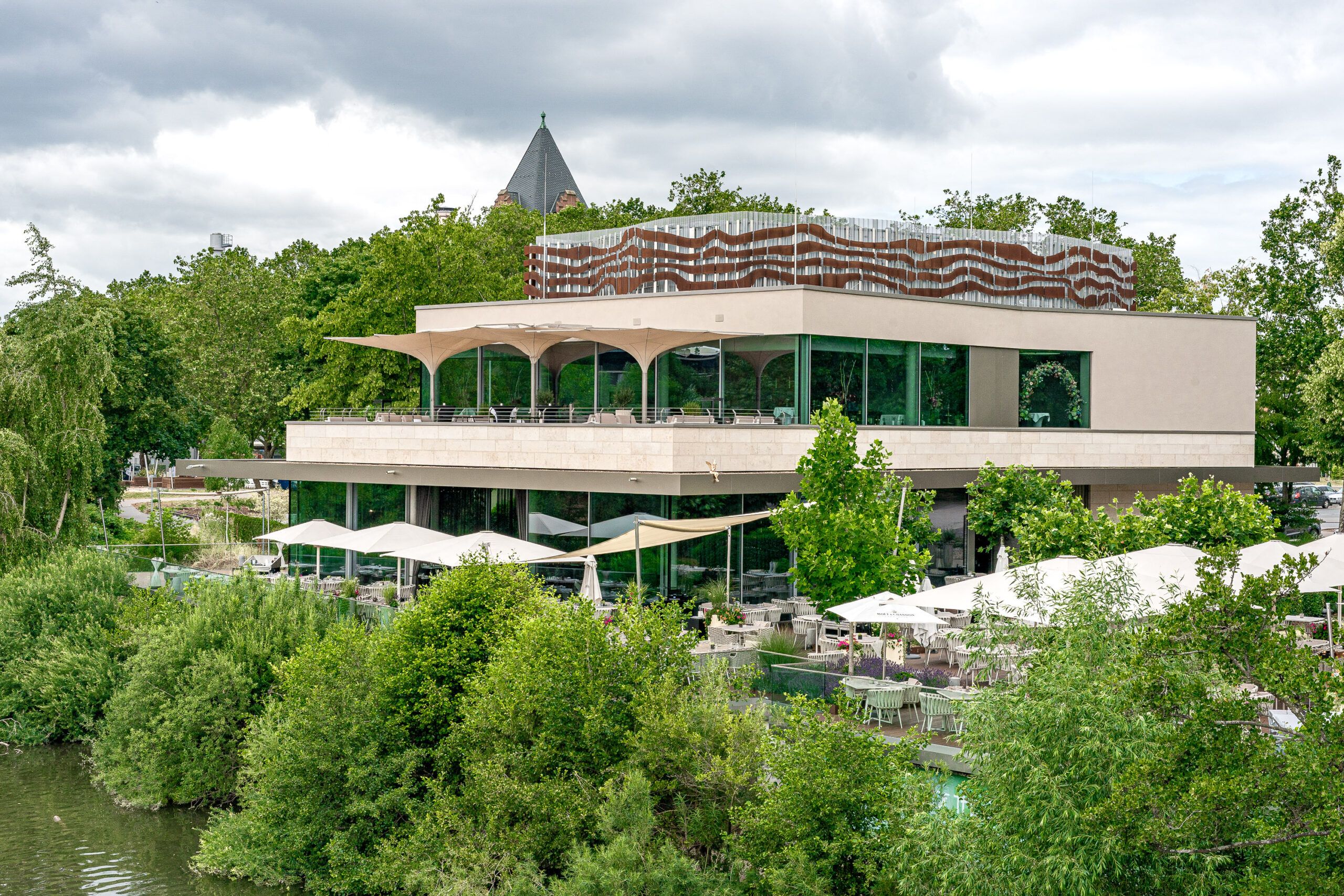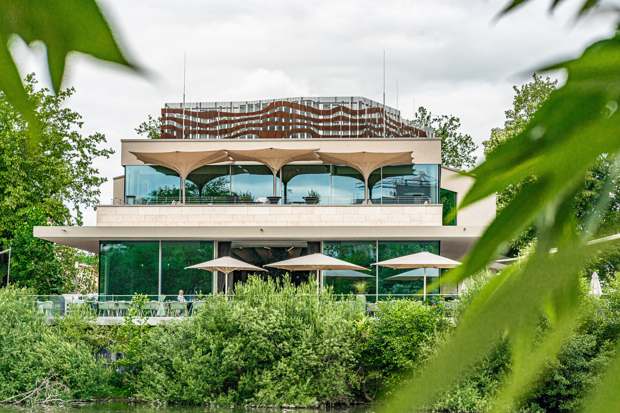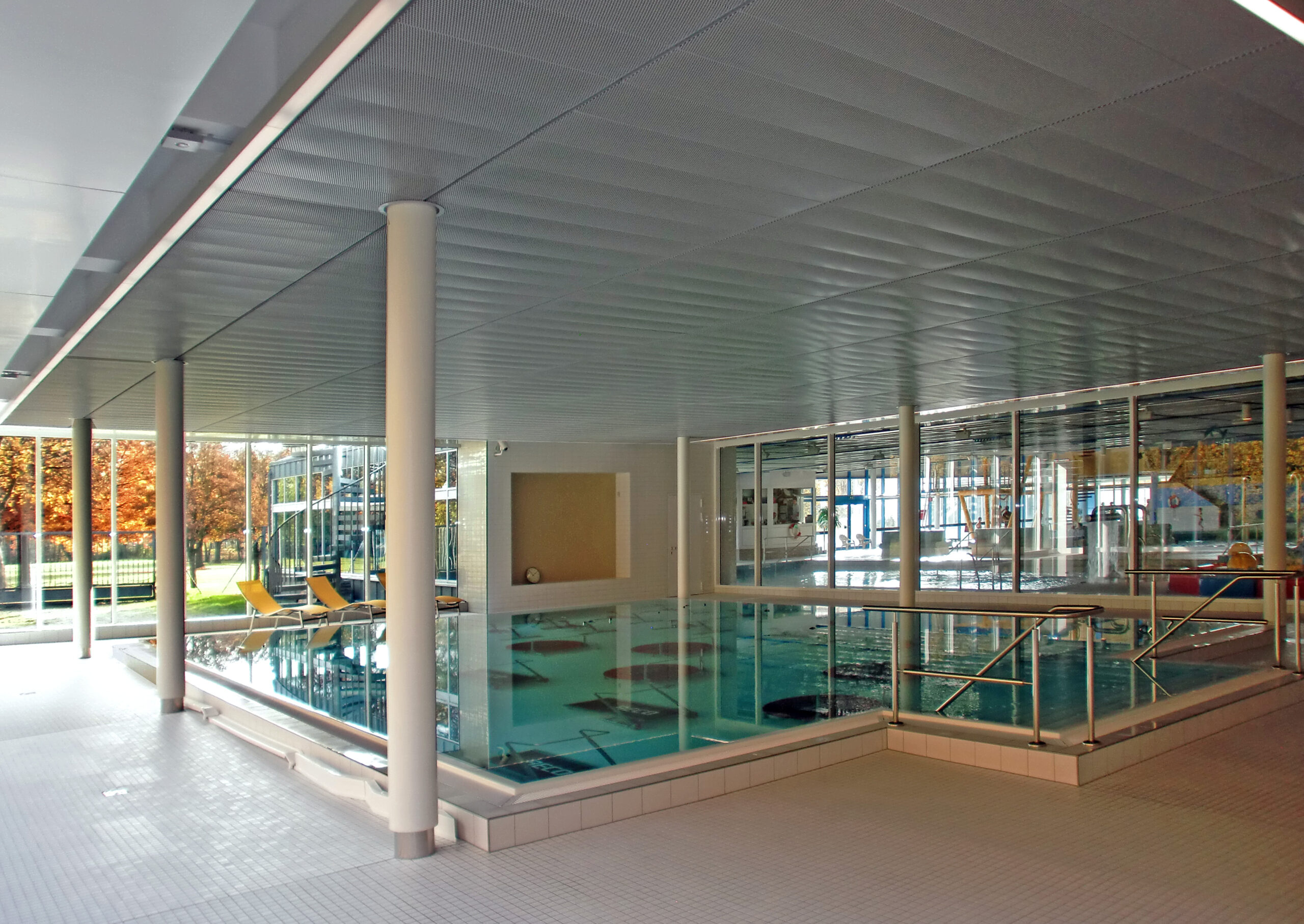 Mit der Erweiterung des Schwimmbades Ringallee und der Fassadensanierung der Schwimmhalle hat das in der Bevölkerung beliebte Bad aus den 60er Jahren ein frisches Gesicht durch eine zusätzliche Wasserfläche für `Aquafitness´ erhalten. Eine Blechfassade in unterschiedlich breiten Segmenten und nuancierten Blautönen spiegelt die Funktion des Gebäudes nach außen wider. Der neue Raum verbindet sich durch seine großen Glasfassaden mit der umliegenden Parkanlage. Innen- und Außenraum fließen somit ineinander. Wie eine `schwebende Scheibe´ legt sich die glatte Streckmetalldecke über das Becken und prägt die ruhige und ausgewogene Raumatmosphäre.