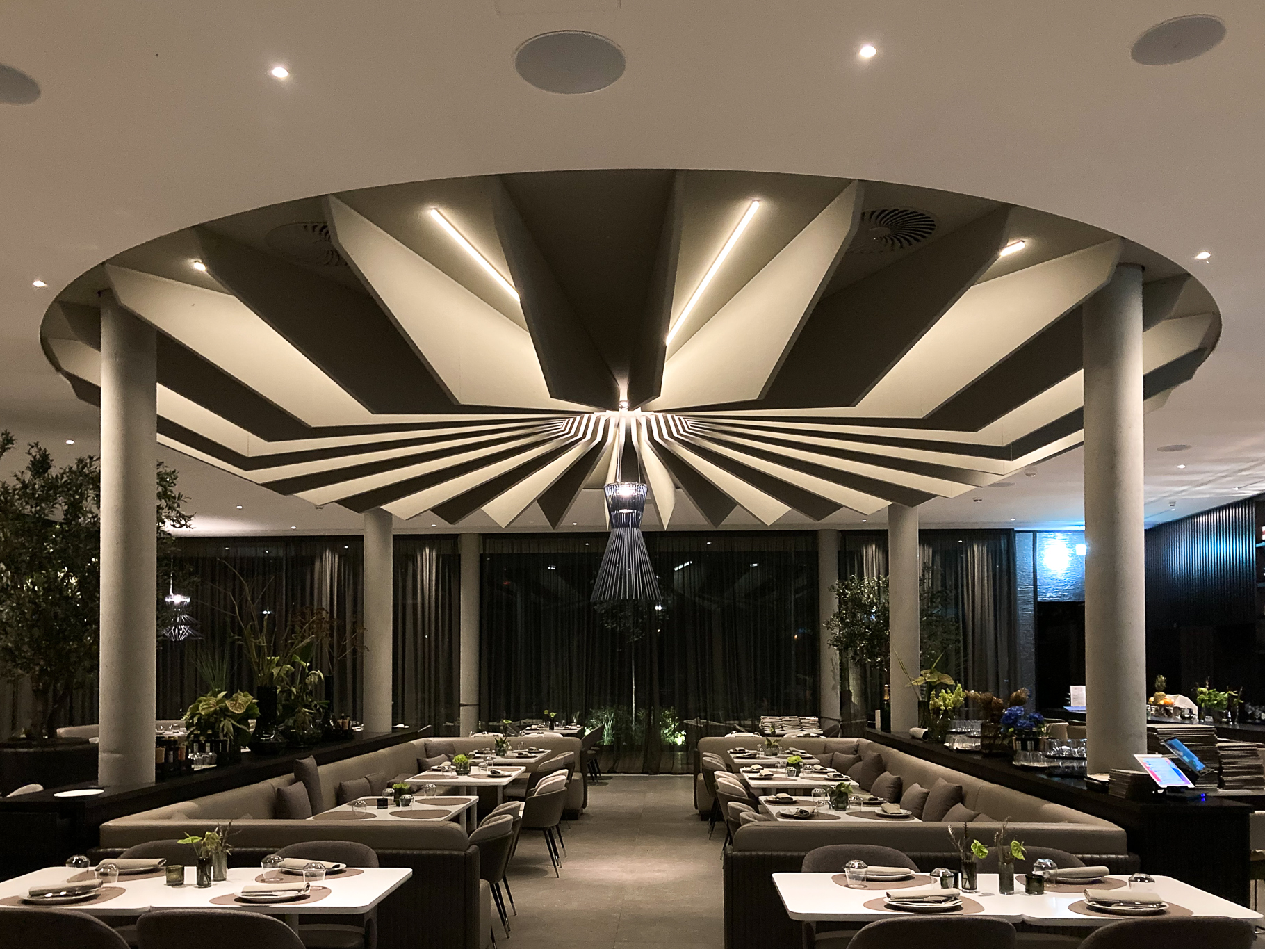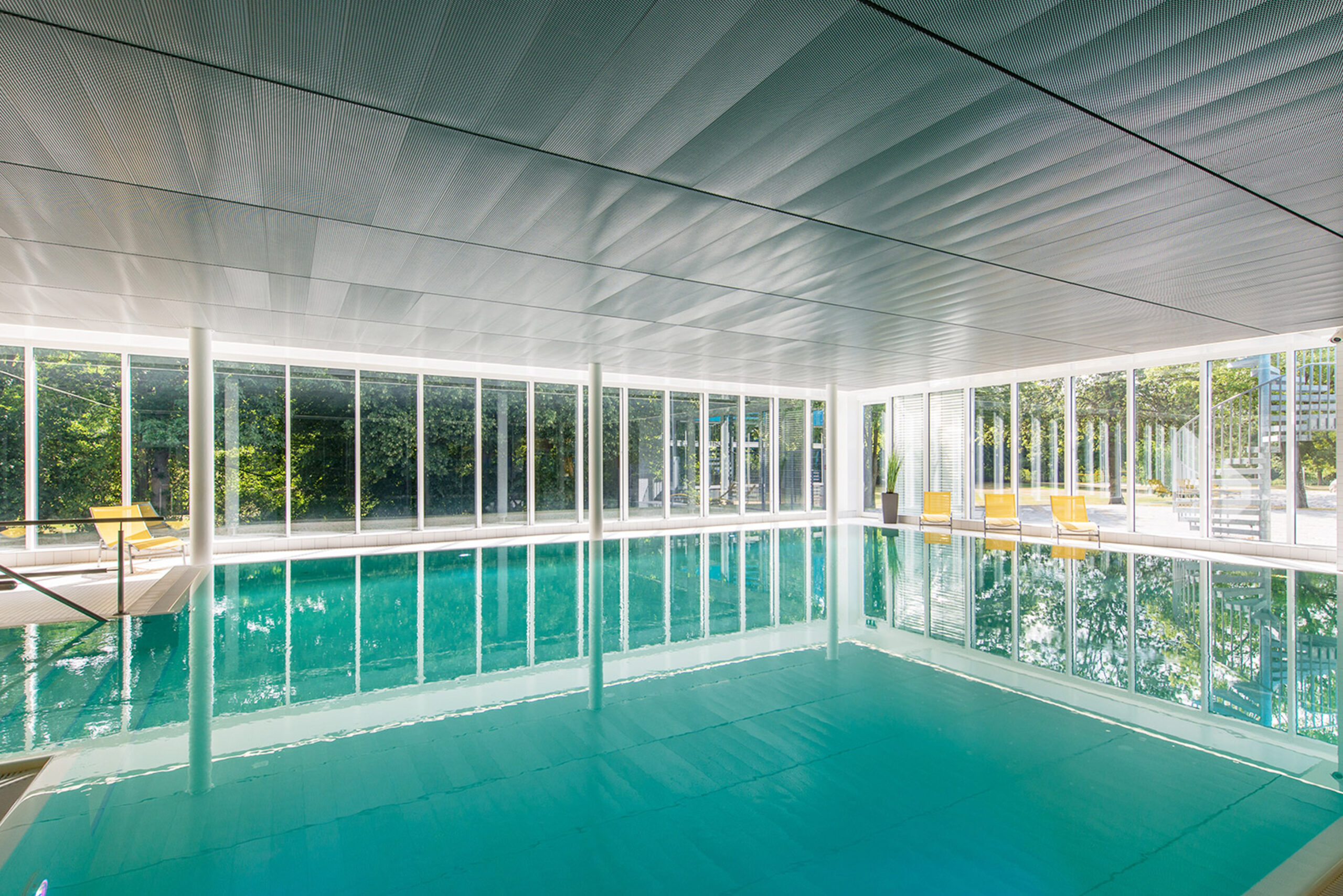 Der Saunabereich erweitert sich durch einen Ruheraum in Holzbauweise und einer Freiluftfläche mit einem filigranen Stahl-Glasdach. Die Fassade der Eingangshalle erhält raumhohe Fassadenelemente und wird somit wieder in ihre alten Proportionen zurückgeführt. Ein großer Windfang mit einem `Flugdach´ empfängt die Badegäste.